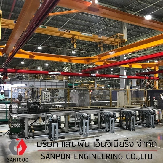 เครนเหนือศีรษะแบบคานเดี่ยว ติดตั้งเครนเหนือศีรษะแบบคานเดี่ยว เครนโรงงานแบบคานเดี่ยว Single Girder Overhead Crane เครนเหนือศีรษะแบบคานเดี่ยว หรือ เครนโรงงานแบบคานเดี่ยว หรือ Single Girder Overhead Crane เหมาะสำหรับโรงงานอุตสาหกรรมที่ต้องการยกน้ำหนักไม่มากนัก คานและรางตั้งอยู่บนเสาอาคาร ตัวเครนตั้งอยู่บนอาคาร สามารถใช้งานได้มากถึง 6 ทิศทาง คือ ซ้าย - ขวา, หน้า - หลัง, บน - ล่าง ตัวรอกวิ่งอยู่ใต้คาน คุณสมบัติและลักษณะเด่นของเครนเหนือศีรษะ แบบคานเดี่ยว มีน้ำหนักยกตั้งแต่ 1 ton ถึง 12.5 ton หรือ 1,000 kg ถึง 12,500 kg มีความกว้างในการใช้งานตั้งแต่ 6 - 25 เมตร สามารถยกวัตถุเคลื่อนที่ชิดซ้าย - ขวาได้มากขึ้น ประโยชน์ในการนำไปใช้ สำหรับเครนเหนือศีรษะ แบบคานเดี่ยว โครงสร้างตัวเครนมีน้ำหนักเบา ใช้พลังงานน้อยการปฏิบัติงาน มีรอก (Hoist) ที่ออกแบบและผลิตเป็นมาตรฐานรุ่นต่างๆ สำหรับเครนเหนือศีรษะ แบบคานเดี่ยวอยู่แล้วสำหรับแขวนประกอบกับเครนชนิดนี้ บริษัท แสนพัน เอ็นจิเนียริ่ง จำกัด ผู้ผลิตและติดตั้งเครนโรงงานทุกชนิด ต้องการสอบถามหรือขอคำแนะนำได้ที่ Tel : 098-5291909